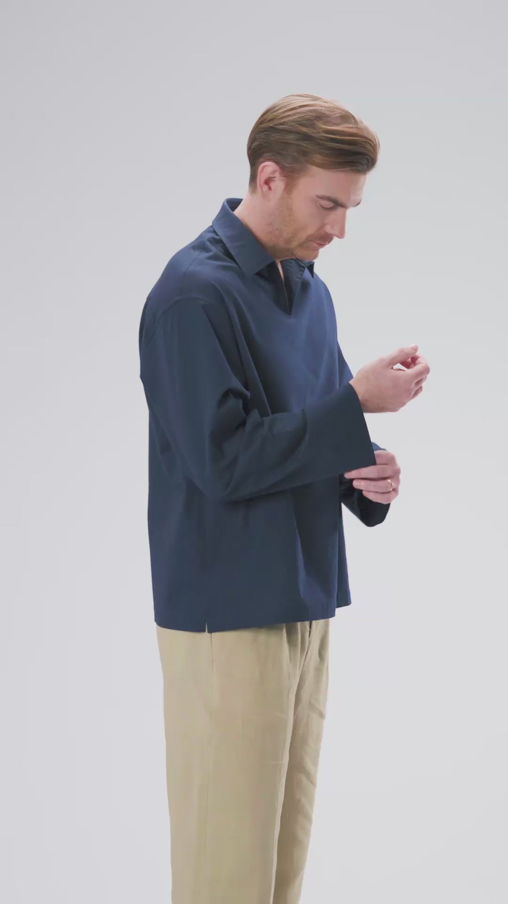 The vareuse collar lends a distinctive character with its open V-shaped neckline, creating a relaxed yet polished silhouette. Crafted from a premium linen-cotton blend, it is lightweight, breathable, and soft on the skin, ensuring lasting comfort and understated luxury throughout the day.