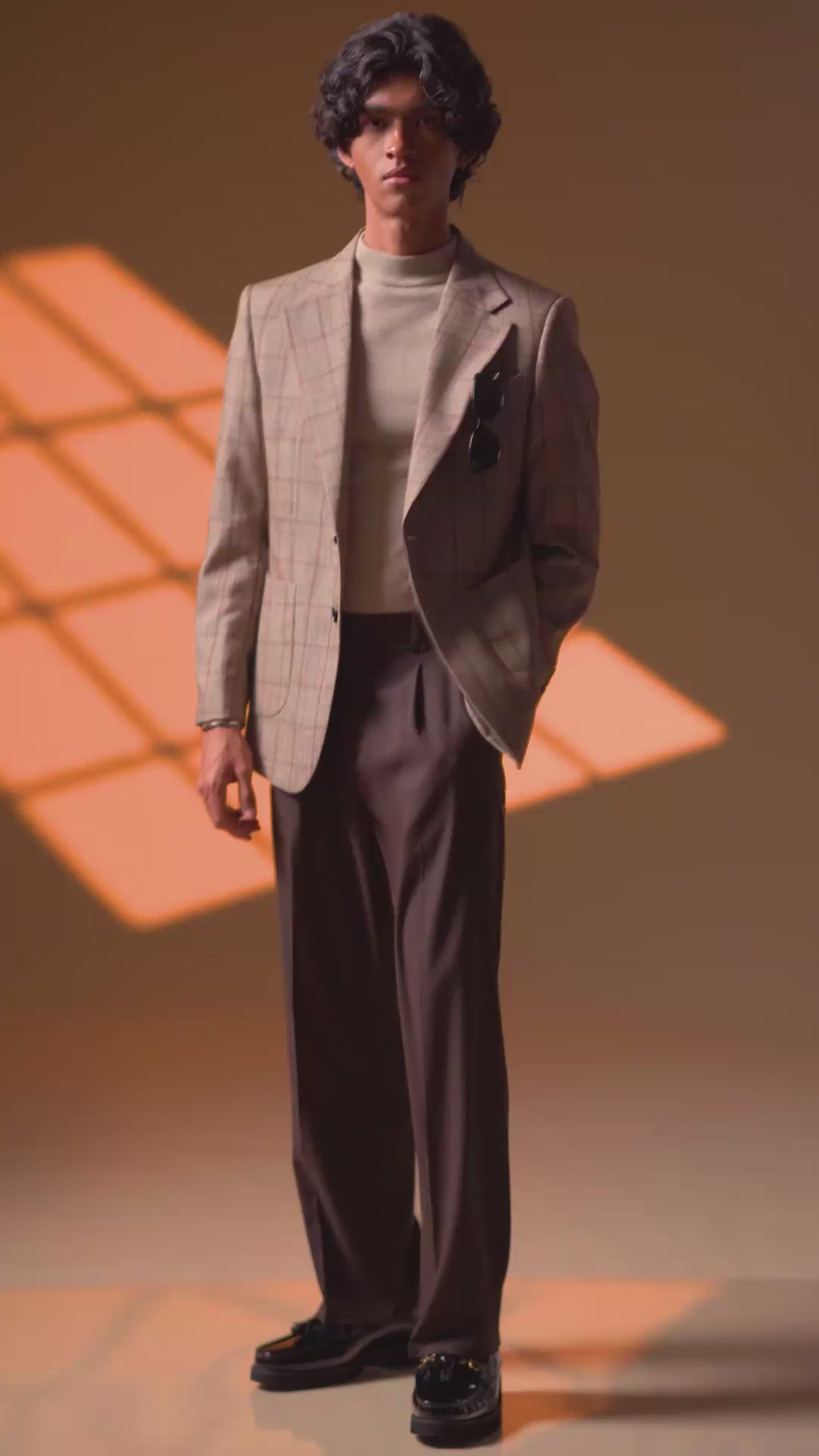 Crafted for laid-back refinement, this sand brown blazer with camel checkered lines is the perfect balance of comfort and style. Its lightweight and breathable fabric makes it ideal for warm weather, while the patch pocket detail adds a relaxed, sartorial charm.
